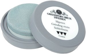 Gransfors Bruks Axe Sharpening Stone - The Gransfors Bruks Ceramic Axe Stone is the standard sharpening and honing tool for your axes. The stone is normally used with water,but can also be used dry. The stone is round and flat with a phase around the edges to prevent chipping. The fine side is 2/3 of the total thickness. The stone has a protective rubber casing. Diameter: 57mm Weight: 160g The stone is suitable for the touch up of minor imperfections and normal wear of your axe and to give the edge its original sharpness. Clean the a